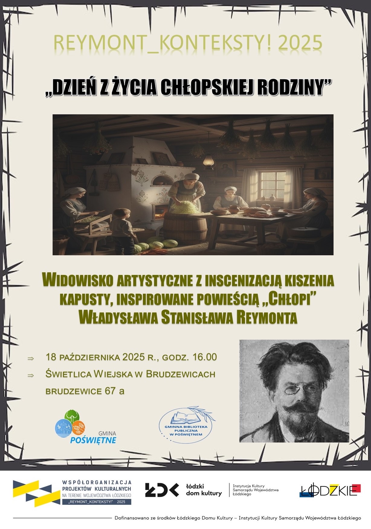 Wójt Gminy Poświętne Łukasz Glimasiński oraz Gminna Biblioteka Publiczna w Poświętnem zapraszają miłośników literatury i tradycji na widowisko artystyczne „Dzień z życia chłopskiej rodziny”, inspirowane powieścią „Chłopi” Władysława Stanisława Reymonta, które odbędzie się w sobotę 18 października o godz. 16.00 w Świetlicy Wiejskiej w Brudzewicach.
