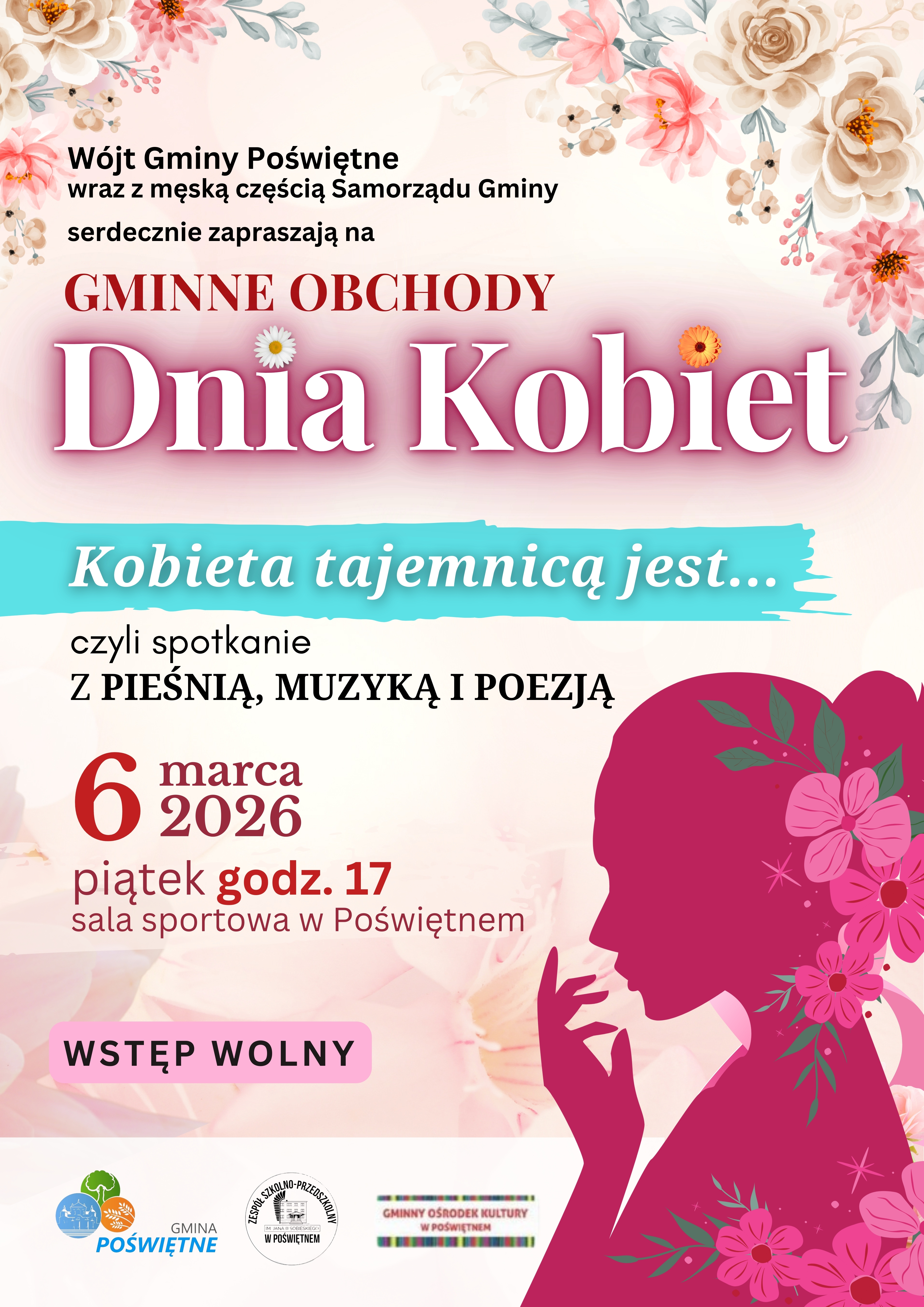 Wójt Gminy Poświętne wraz z męską częścią Samorządu Gminy serdecznie zapraszają wszystkie Panie (i nie tylko!) na wyjątkowy wieczór pełen pięknych emocji, muzyki i poezji. „Kobieta tajemnicą jest…”, czyli spotkanie z pieśnią, muzyką i poezją w wyjątkowej, nastrojowej oprawie 6 marca 2026 r. (piątek), godz. 18:00, sala sportowa w Poświętnem. Wstęp wolny.