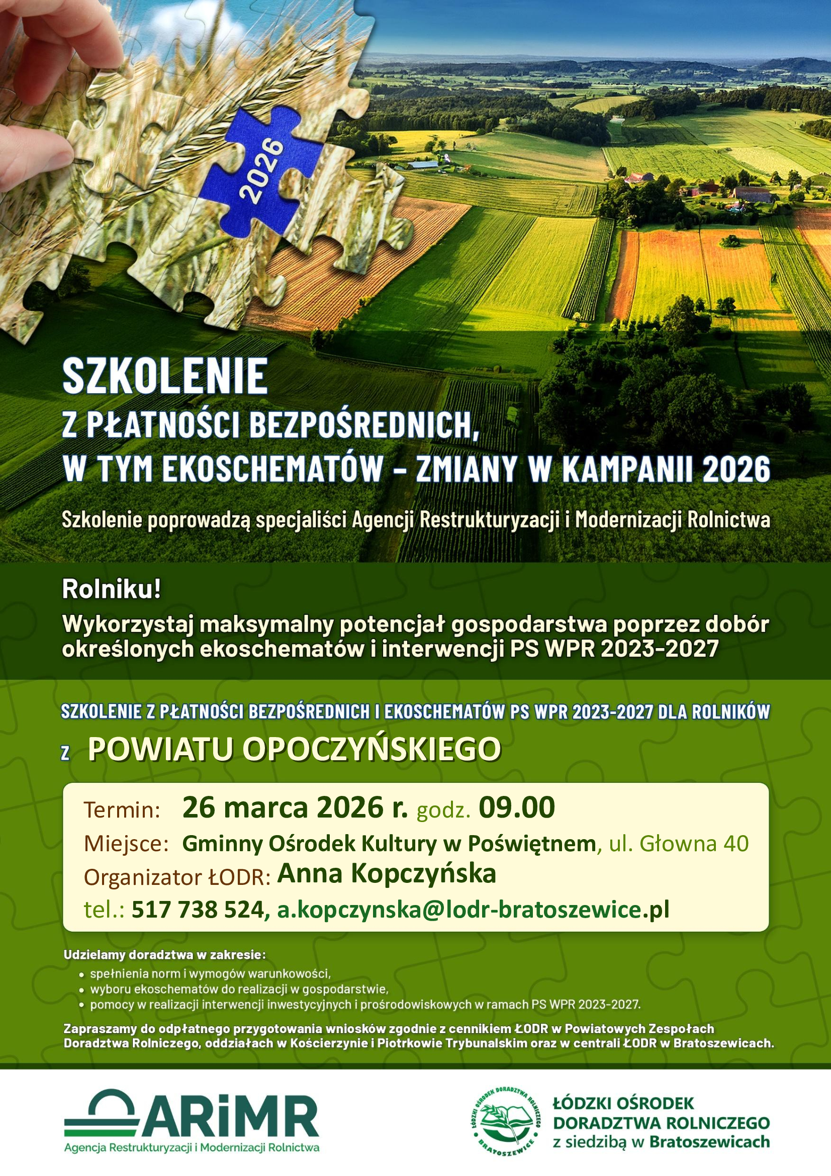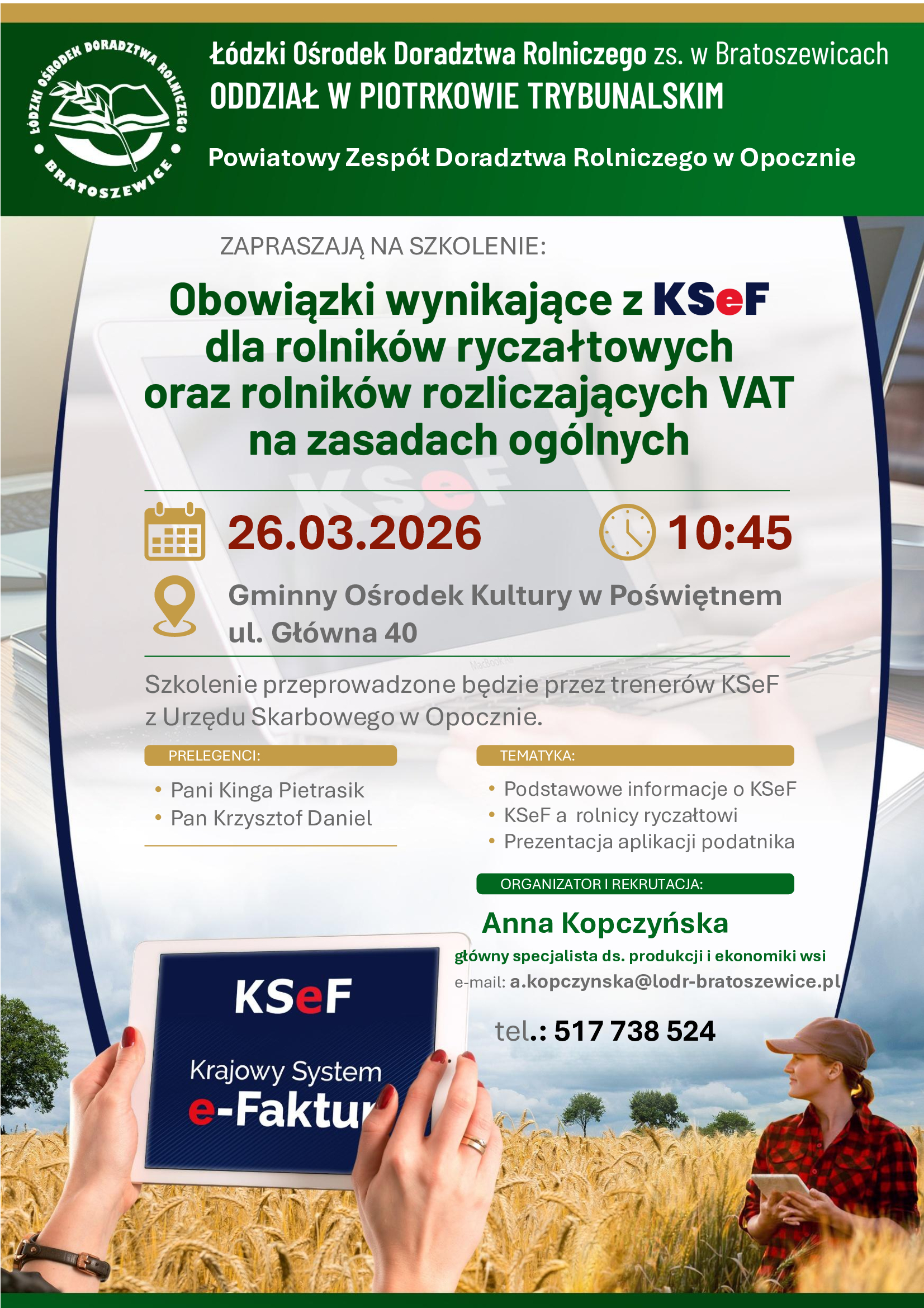 Łódzki Ośrodek Doradztwa Rolniczego z siedzibą w Bratoszewicach zaprasza rolników z terenu Gminy Poświętne oraz powiatu opoczyńskiego na dwa szkolenia dotyczące aktualnych zagadnień związanych z prowadzeniem gospodarstwa rolnego, płatnościami bezpośrednimi oraz systemem e-Faktur (KSeF).