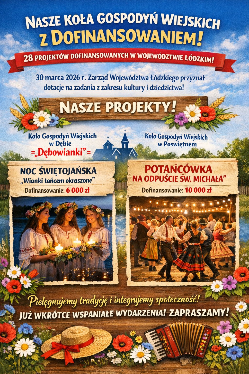 30 marca 2026 r. Zarząd Województwa Łódzkiego rozstrzygnął trzeci otwarty konkurs ofert na realizację zadań publicznych w obszarze kultury, sztuki oraz ochrony dziedzictwa narodowego. W ramach konkursu dofinansowanie otrzymało 28 projektów z terenu województwa łódzkiego. Wśród wyróżnionych inicjatyw znalazły się również projekty przygotowane przez Koła Gospodyń Wiejskich działające na terenie naszej gminy.