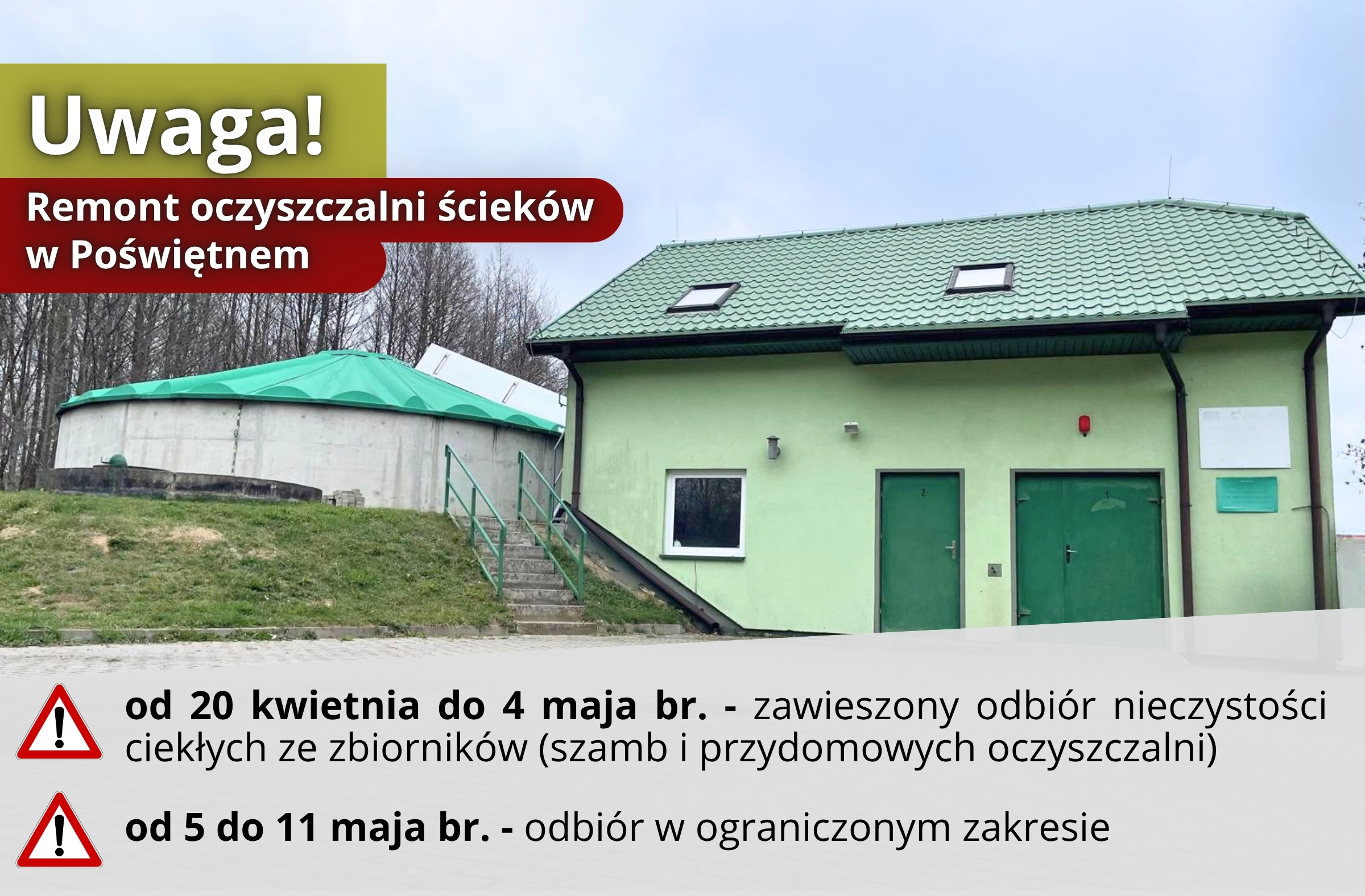 - w okresie od 20 kwietnia do 4 maja zawiesić przyjmowanie nieczystości ciekłych ze zbiorników bezodpływowych (szamb) oraz przydomowych oczyszczalni ścieków,