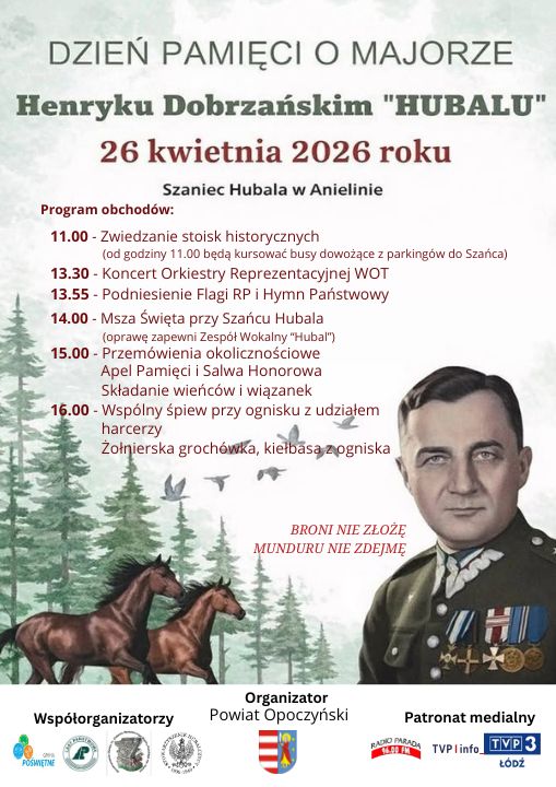 Zapraszamy mieszkańców oraz wszystkich zainteresowanych do udziału w uroczystych obchodach Dnia Pamięci o Majorze Henryku Dobrzańskim „Hubalu”, które odbędą się w dniu 26 kwietnia 2026 roku przy Szańcu Hubala w Anielinie.
