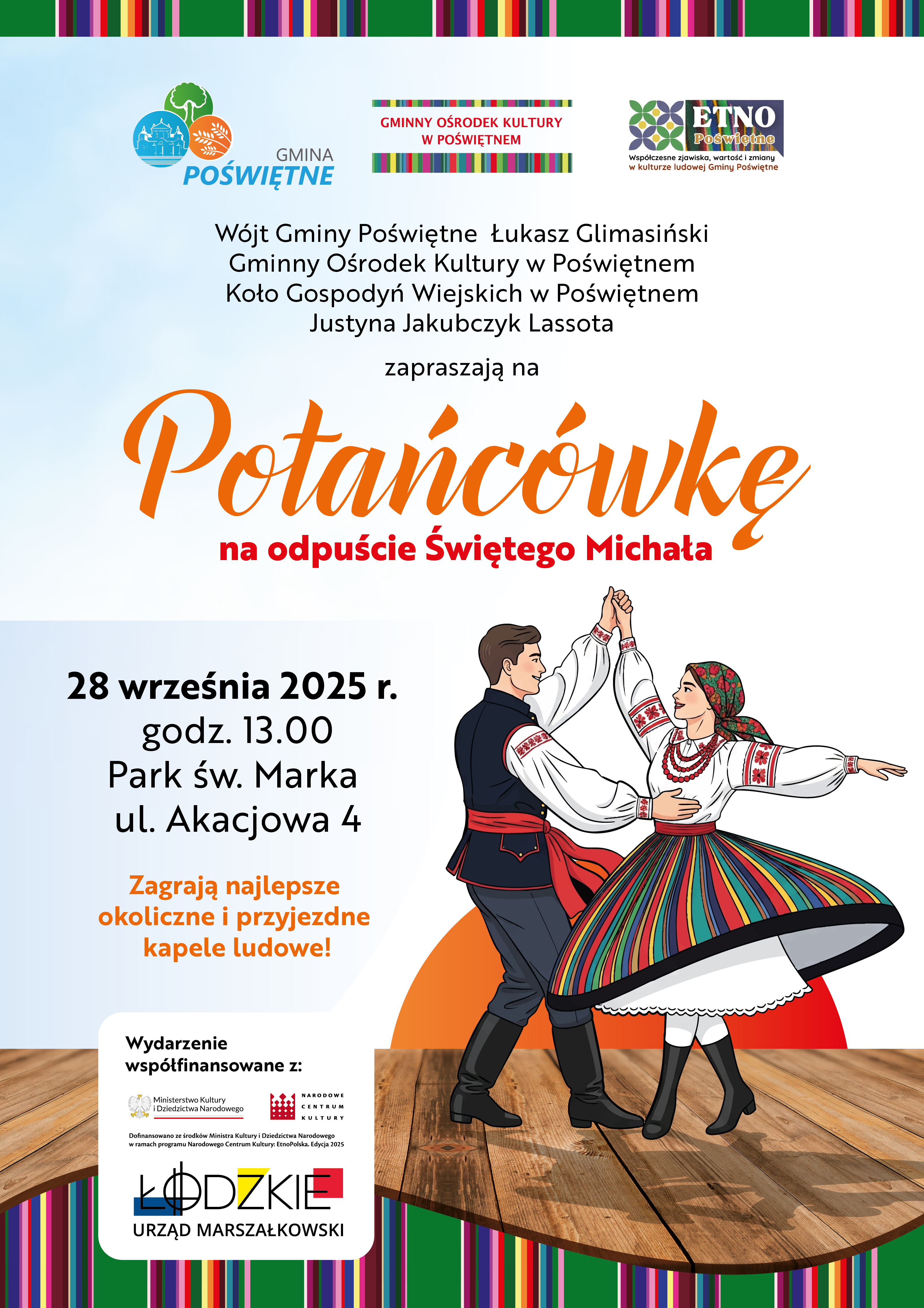 Wójt Gminy Poświętne Łukasz Glimasiński, Gminny Ośrodek Kultury w Poświętnem, Koło Gospodyń Wiejskich w Poświętnem oraz Justyna Jakubczyk-Lassota serdecznie zapraszają na „Potańcówkę na odpuście Świętego Michała " czyli niezwykłe spotkanie z muzyką i tańcem ludowym, które odbędzie się w przyszłą niedzielę, 28 września. Przy tradycyjnych drewnianych dechach wystąpią muzycy starego i młodego pokolenia, mistrzowie muzyki tradycyjnej oraz znakomici kontynuatorzy: Zespół ludowy „Zygmuntowiacy” z Koluszek, Kapela Bobrowianie z Bobrowca, Ludowy Zespół Obrzędowy „Wilkowianie” z Wilkowic, Roman Wojciechowski z Kapelą, Zespół Ludowy Czerniewiczanie, KGW z Dęby oraz gospodarze wydarzenia - KGW Poświętne. Drewniane dechy organizatorzy przekażą na kilka godzin miłośnikom oraz pasjonatom tańca ludowego, choć i osoby chcące się nauczyć tej sztuki również są mile widziane. Dla tej części uczestników przewidziane są bowiem warsztaty tańca, pod okiem wielokrotnie nagradzanego instruktora. Tak więc, widzimy wszyscy w niedzielę 28 września od godz. 13.00 w Parku św. Marka przy ul. Akacjowej. Wydarzenie pn. „Potańcówka na odpuście Świętego Michała” jest zwieńczeniem projektu realizowanego przez Gminny Ośrodek Kultury w Poświętnem „EtnoPolska 2025” z Narodowego Centrum Kultury pn. „Współczesne zjawiska, wartość i zmiany w kulturze ludowej gminy Poświętne”, jak również częścią zadania publicznego pn. „Potańcówka na odpuście świętego Michała” realizowanego przez KGW Poświętne w ramach 1 otwartego konkursu ofert na realizację zadań publicznych Województwa Łódzkiego z zakresu kultury, sztuki, ochrony dóbr kultury i dziedzictwa narodowego w 2025 roku.