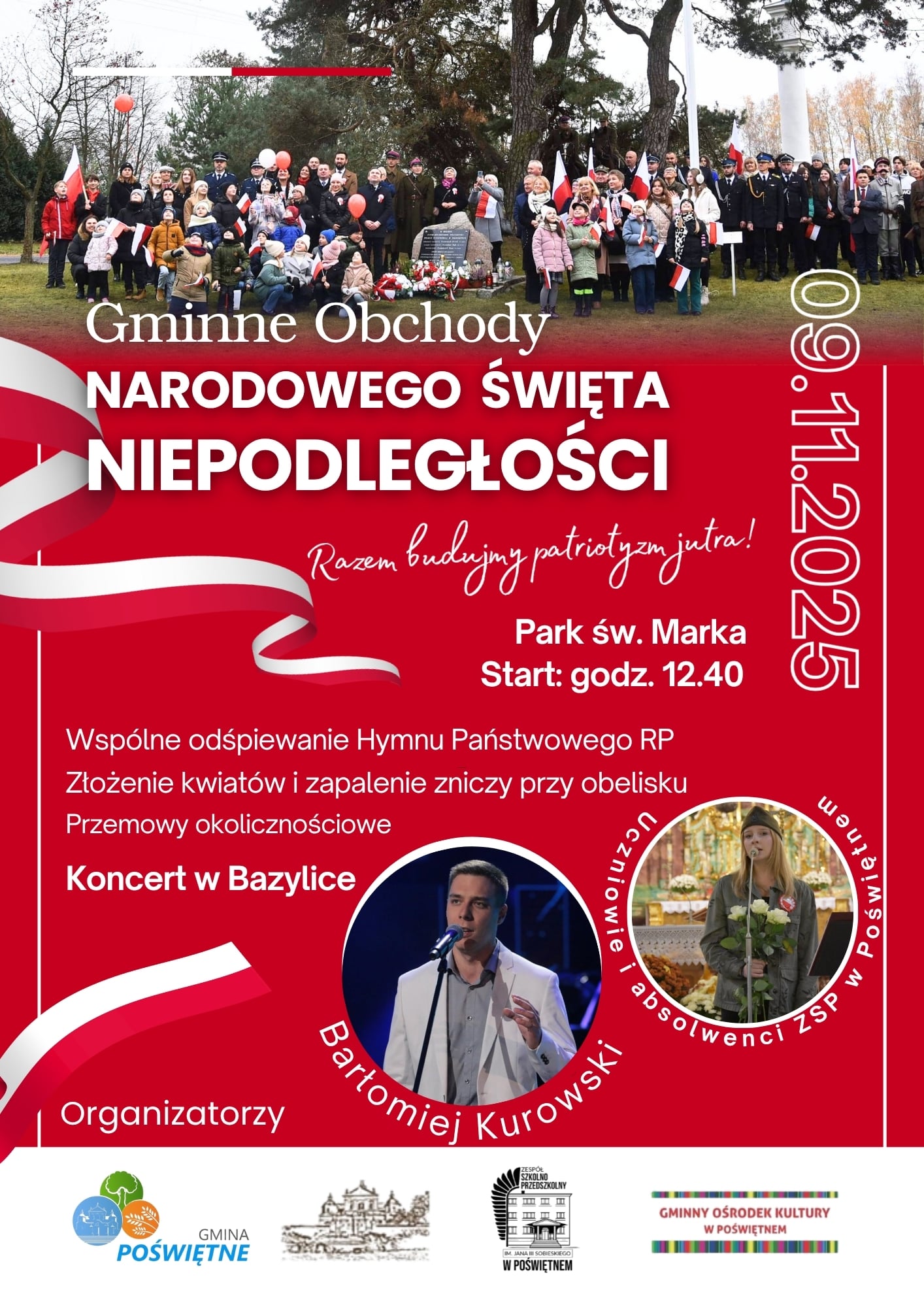 Serdecznie zapraszamy wszystkich mieszkańców gminy Poświetne, w niedzielę 9 listopada, na Gminne Obchody Narodowego Święta Niepodległości. Uroczystości rozpoczniemy o godzinie 12.40 w Parku św. Marka w Poświętnem, gdzie przy obelisku poświęconemu pamięci zamordowanych przez NKWD wiosną 1940 r. policjantów, oddamy hołd wszystkim bohaterom walki o wolność i niepodległość naszej Ojczyzny. Drugą częścią uroczystości będzie koncert patriotyczny w Bazylice św. Rodziny w Studziannie, w którym wystąpią uczniowie i absolwenci Szkoły Podstawowej w Poświętnem oraz Bartłomiej Kurowski.