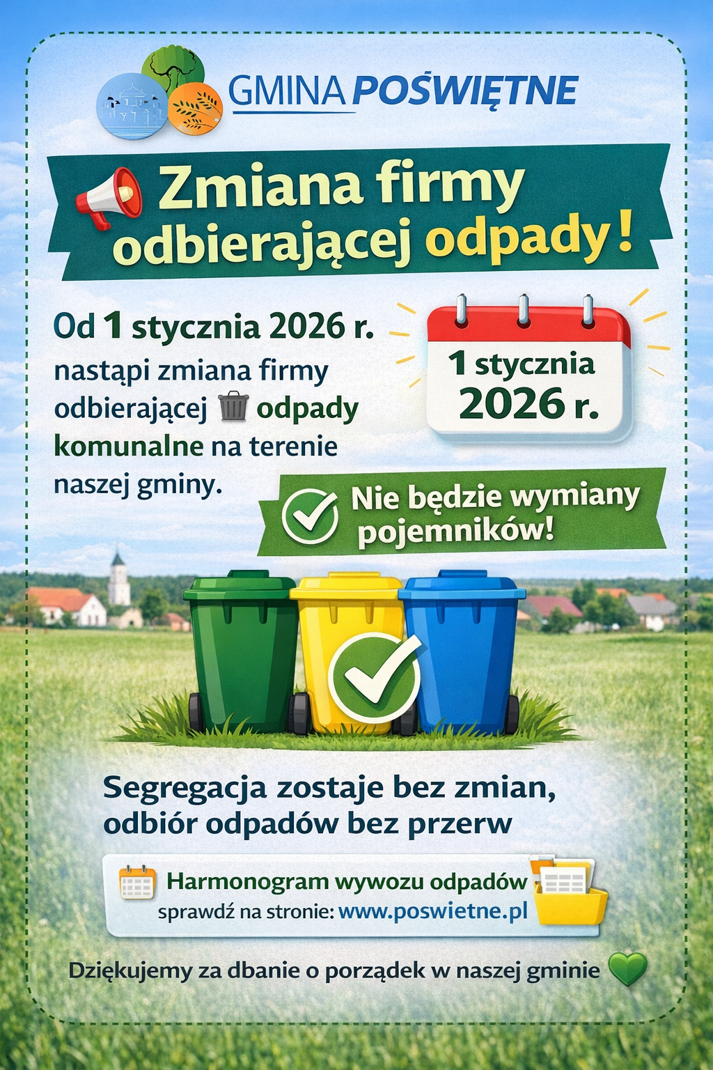 Od 1 stycznia 2026 r. nastąpi zmiana firmy odbierającej odpady komunalne na terenie naszej gminy.