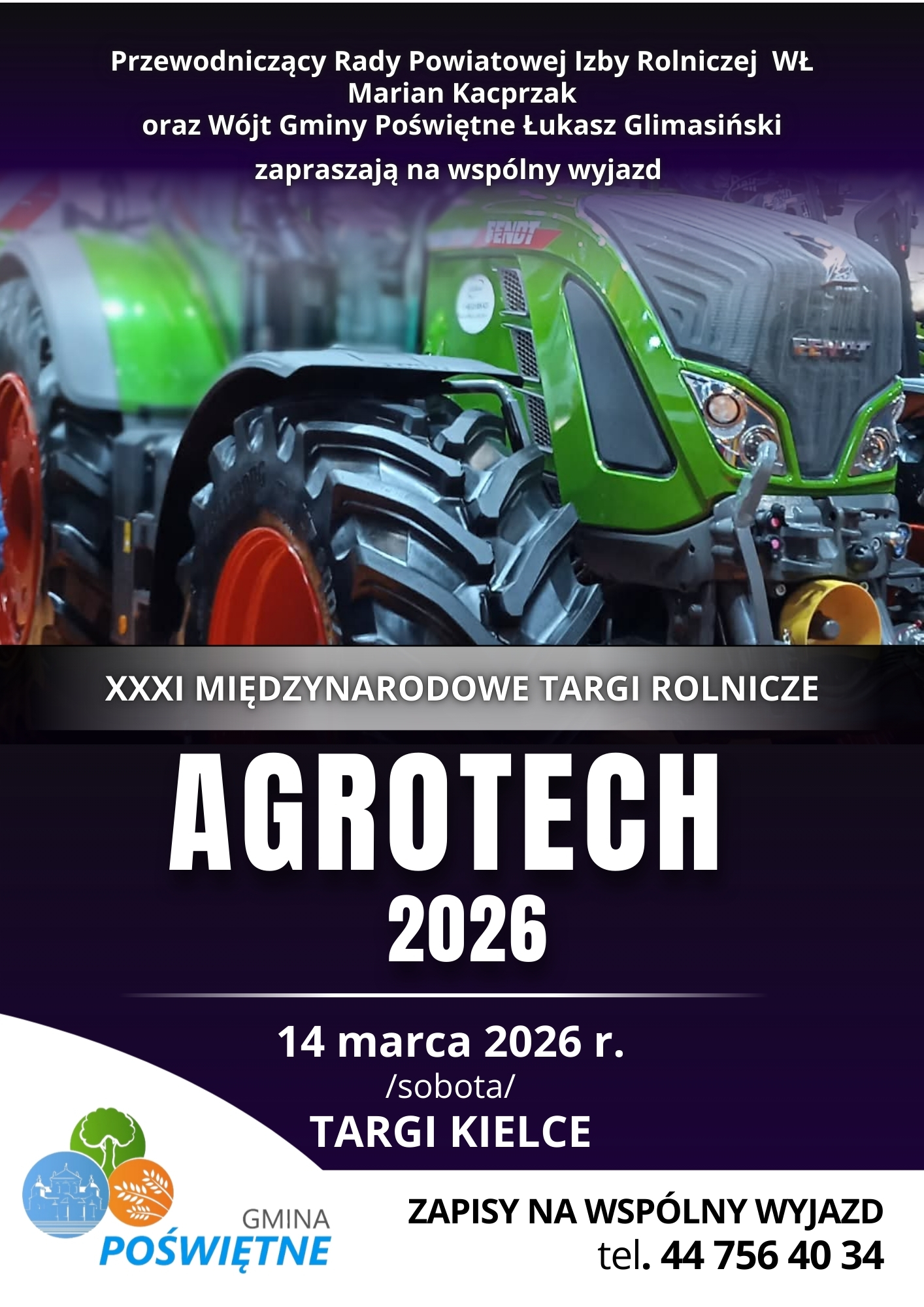 Wraz z Przewodniczącym Rady Powiatowej Izby Rolniczej Województwa Łódzkiego Panem Marianem Kacprzakiem serdecznie zapraszamy do udziału w wyjeździe organizowanym w sobotę 14 marca 2026 r. na XXXI Międzynarodowe Targi Techniki Rolniczej AGROTECH w Kielcach.