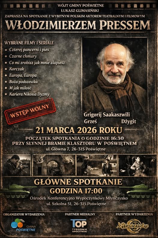 Serdecznie zapraszamy na wyjątkowe spotkanie z wybitnym polskim aktorem teatralnym i filmowym Włodzimierzem Pressem. Wydarzenie jest drugim spotkaniem autorskim w cyklu „FILMOWE ŚLADY POŚWIĘTNEGO”, podczas którego będziemy mieli okazję porozmawiać o filmie, teatrze i kulisach pracy aktorskie. Artysta znany jest z wielu znakomitych produkcji filmowych i serialowych, ale dla mieszkańców naszej gminy to przede wszystkim niezapomniany Grigorij Saakaszwili z produkcji "Czterej pancerni i pies".